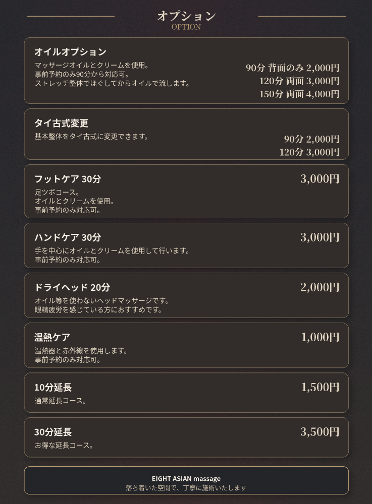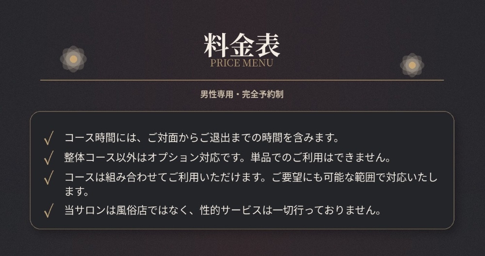 当サロンは3人体制でやってます。治療院やリラクゼーションサロンで積み重ねた経験を活かしてご満足頂ける施術を行います。男性専用のサロンになりますが性的なサービスは行っておりません。
